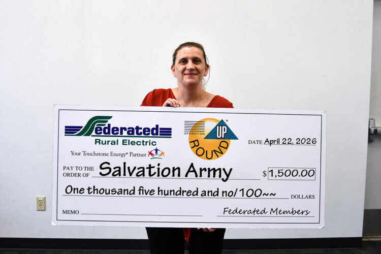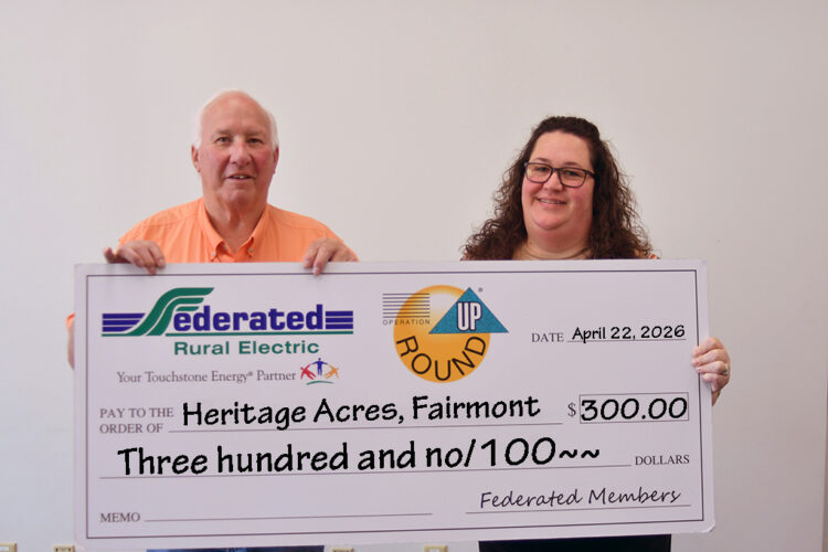 ABOVE: FAIRMONT — The Federated Rural Electric Trust in Jackson recognized local organizations through Operation Round Up. The Salvation Army’s Heat Share Program receives $1,500 for emergency energy assistance for Federated members in need, according to Krystal Stover.