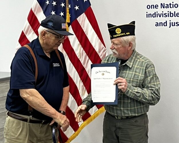 ABOVE: FAIRMONT — Ernie Nuss was awarded a Certificate of Appreciation for his past work on the Finance Committee from American Legion Lee C Prentice Post 36 Finance Officer Jeff Schultz.