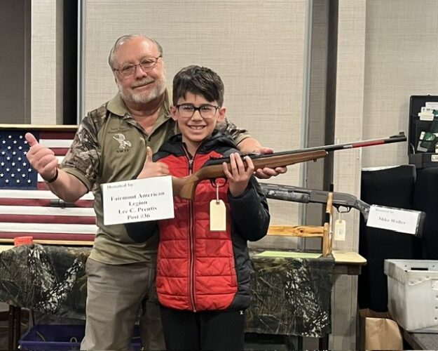 ABOVE: FAIRMONT — Joseph Gonzalez with the winning ticket for a youth firearm, donated by American Legion Lee C Prentice Post 36 and presented by Post 36 member and Wild Turkey Federation Chairman Joe Dubke at the Fairmont banquet.