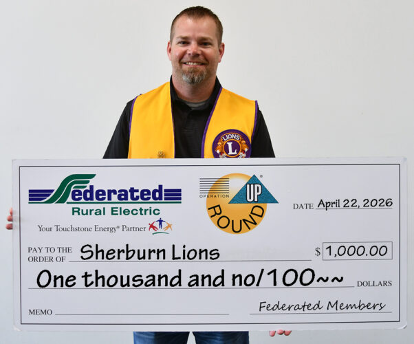 ABOVE: SHERBURN — The Federated Rural Electric Trust in Jackson recognized local organizations through Operation Round Up. The Sherburn Lions, represented by Mark Wohlhuter, accept $1,000 to build accessibility ramps for Sherburn homes.