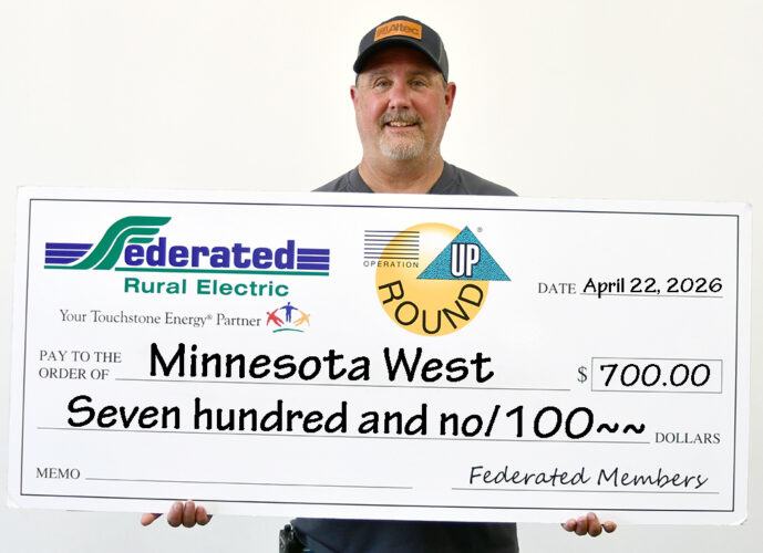 ABOVE: JACKSON — The Federated Rural Electric Trust in Jackson recognized local organizations through Operation Round Up. Minnesota West Community and Technical College in Jackson will award a $700 scholarship to a Jackson or Martin County line worker or electrician student. Doug Schuett accepted the check.