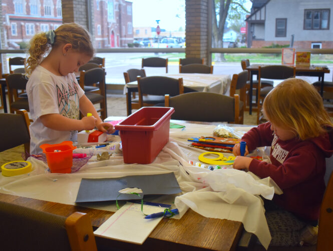 ABOVE: Julia and Everly Teachout color their crafts during the Kids’ Maker Cart event on Wednesday afternoon in the magazine room at the Martin County Library in Fairmont. Kids’ Maker Cart is offered from 3 to 5 p.m. each Wednesday and includes various materials and supplies to allow children in elementary school to fully unleash their creative side and make anything they want. For additional information about the Martin County Library’s program offerings for children, visit www.martincountylibrary.org.